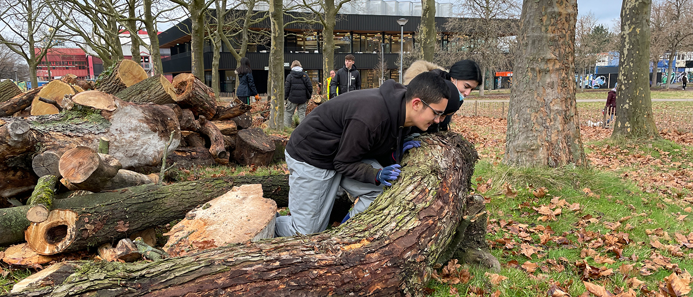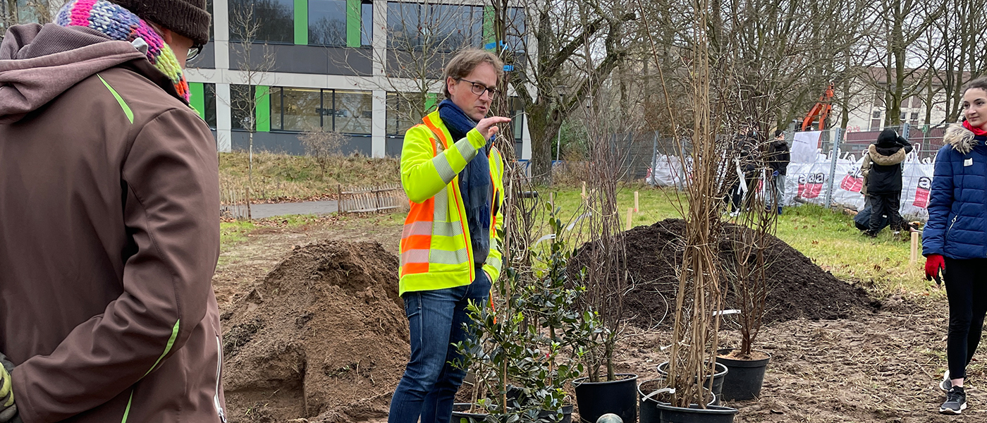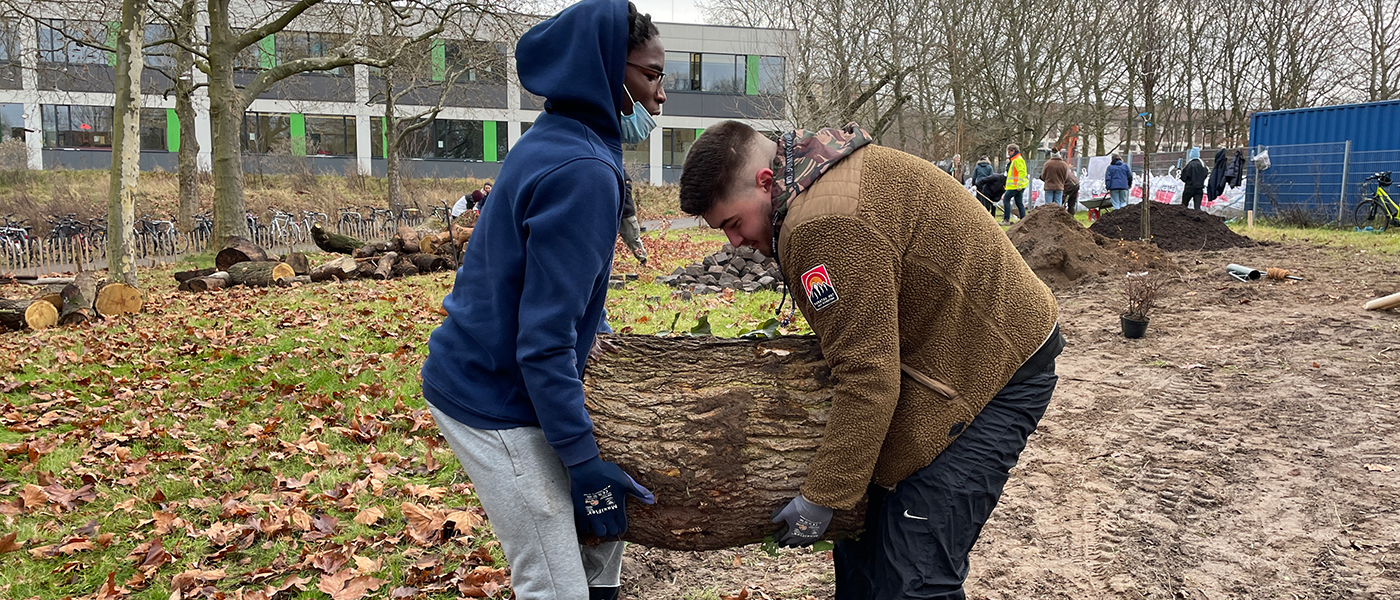 Nach einer erfreulich schnellen Genehmigung ging es auch schon in die Planungsphase. Von September bis November entstanden im Rahmen des Projekts Pläne zur Gestaltung dieser Fläche. Anfang November besuchte uns Herr Haberern in der Schule und wir konnten ihm zwei finale Pläne vorstellen, die auf große Begeisterung stießen. Am 13.12.2021 war es dann so weit. Wir als Biologie-Tutorium halfen, die Fläche gemeinsam mit den Experten des Grünflächenamtes zu bepflanzen. Wir haben Bäume gesetzt, Totholz und Steine umgelagert, sowie im Totholz Wohnraum für Insekten durch Bohrungen geschaffen. Besonders freut uns, dass viele Aspekte unserer Pläne, zum Beispiel, welche einheimischen Sträucher und Bäume gepflanzt werden, oder unsere Idee mit dem Totholz, umgesetzt wurden. Dafür danken wir dem Grünflächenamt und besonders Herrn Haberern!