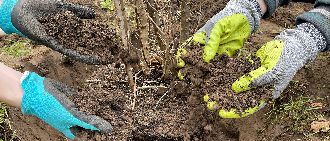 Die Samen werden aber nicht einfach so verteilt. Sie sind mit einem Füllstoff vermischt. Was dieser Füllstoff ist, und warum er wichtig ist, erklärt uns ebenfalls Frau Dyballa: Der Füllstoff besteht aus reinen Getreideprodukten und Holzspänen. Durch diese Streckung lässt sich das Saatgut mit den feinen Wildpflanzensamen wesentlich leichter und gleichmäßiger ausbringen. Vor dem Arbeitsschritt der Aussaat bedarf es allerdings noch der richtigen Bodenvorbereitung. Der Boden muss mithilfe einer Maschine gefräst werden, damit er gelockert ist. Diesen Schritt übernahm die Ausbildungskolonne des Grünflächenamts für uns. Jetzt durften auch wir mit anpacken. Die gefräste Fläche muss zuerst eingeebnet werden. Mit einem Rechen glätteten und verteilten wir die lockere Erde gleichmäßig. Jetzt war der Boden bereit für die Aussaat. Auch hier wurde uns von den Profis gezeigt, wie es richtig geht. Eine Handvoll Saatgut wird immer wieder mit einem kräftigen Schwung aus dem Handgelenk gleichmäßig über die Fläche verteilt. Das Bodenstück wird einmal in horizontale Richtung und einmal in vertikale Richtung abgegangen, um sicherzustellen, dass die Samen gleichmäßig verteilt sind. Dabei helfen auch die hellen Holzspäne, durch sie sieht man auf dem dunklen Erdboden gut, an welcher Stelle schon ausreichend Samen liegen und wo noch welche fehlen. Insgesamt brachten wir das Saatgut auf etwa 150 Quadratmeter aus. Nach der Aussaat mussten die Samen angewalzt werden. Dazu zogen wir eine große Walze über den Boden, welche die Samen fest in den Boden drückte. Damit war die Aussaat abgeschlossen. Nun hoffen wir auf viel Regen, damit unsere Samen keimen können.