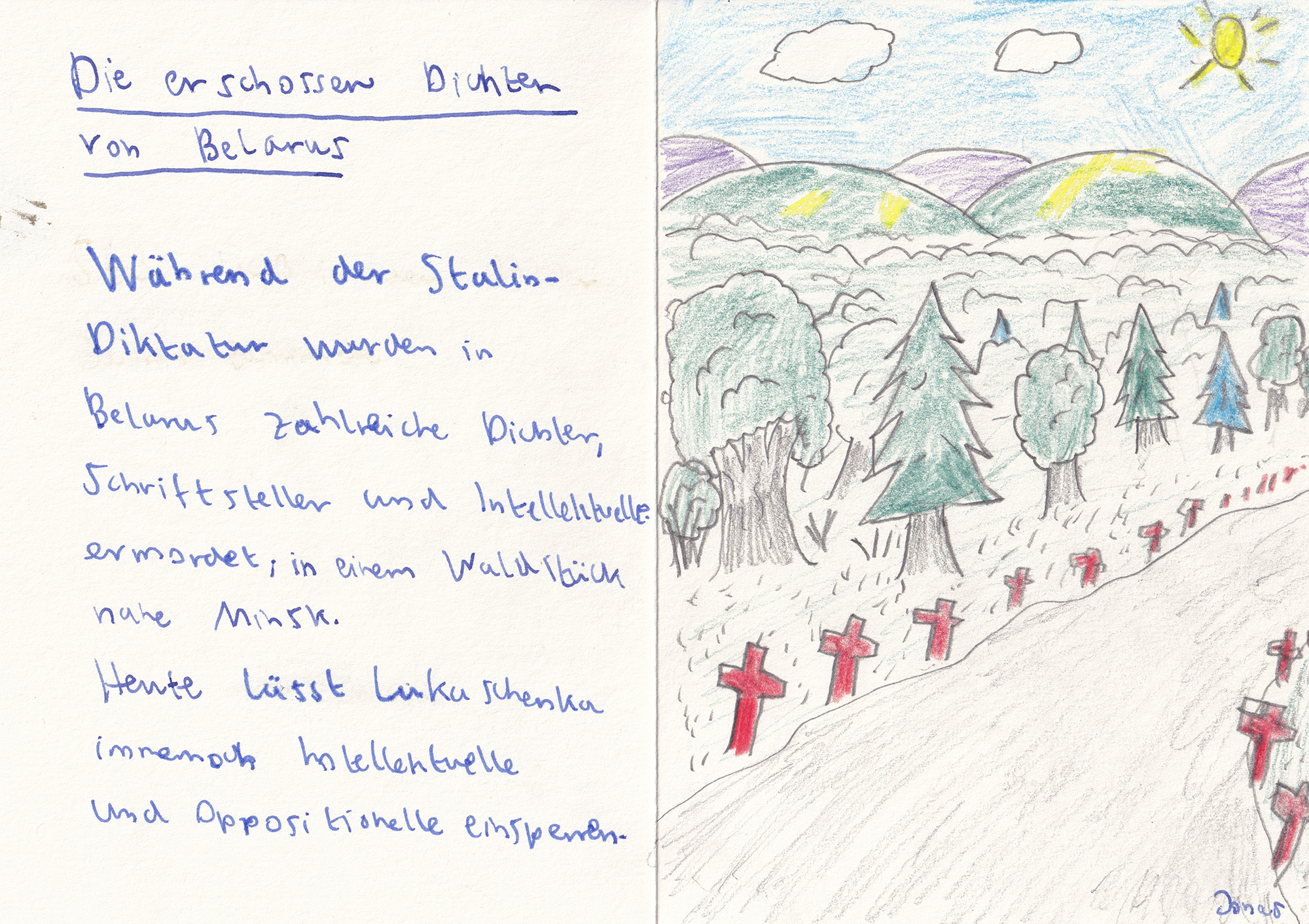 Nach einer Einleitung in die Geschichte Belarus‘, die sich vor allem auf die stalinistische Herrschaft im 20. Jahrhundert sowie die Machtübernahme Lukaschenkos ab 1994 konzentrierte, lag der Fokus des Workshops auf der Nacht vom 29. auf den 30. Oktober 1937. Damals ließ die sowjetische Führung mindestens 130 Personen erschießen, darunter dutzende Dichter, Schriftsteller und Intellektuelle. Damit einher ging die Verbannung ihrer Werke aus Bibliotheken, Schulen und anderen Bildungseinrichtungen. Diese Oktobernacht markiert den tragischen Höhepunkt des Vorgehens des Sowjetregimes gegen die Kulturelite in Belarus. Die Leichen der Erschossenen vergrub man in einem Waldstück nahe der Hauptstadt Minsk, „Kurapaty“. Erst rund 50 Jahre später begannen Forschende mit Ausgrabungsarbeiten in Kurapaty. Zwischen 30.000 und 250.000 Leichen werden dort vermutet. Dutzende Kreuze sollen an sie erinnern. Die Zahl klafft unter anderem so weit auseinander, weil das Lukaschenkoregime noch immer nicht alle Archive öffnet, Aktenansichten verhindert und sich aktiv gegen die Aufarbeitung einsetzt. Nach der Fälschung Lukaschenkos Wahl 2020 kommt es zu massiven Ausschreitungen in Belarus, die Polizei geht gewaltsam gegen Demonstranten vor. In Kurapaty werden die Kreuze, die an die Opfer des Stalinregimes erinnern sollen, kurzerhand zerstört und vernichtet. Eine Aufarbeitung unter Lukaschenko ist nahezu unmöglich.