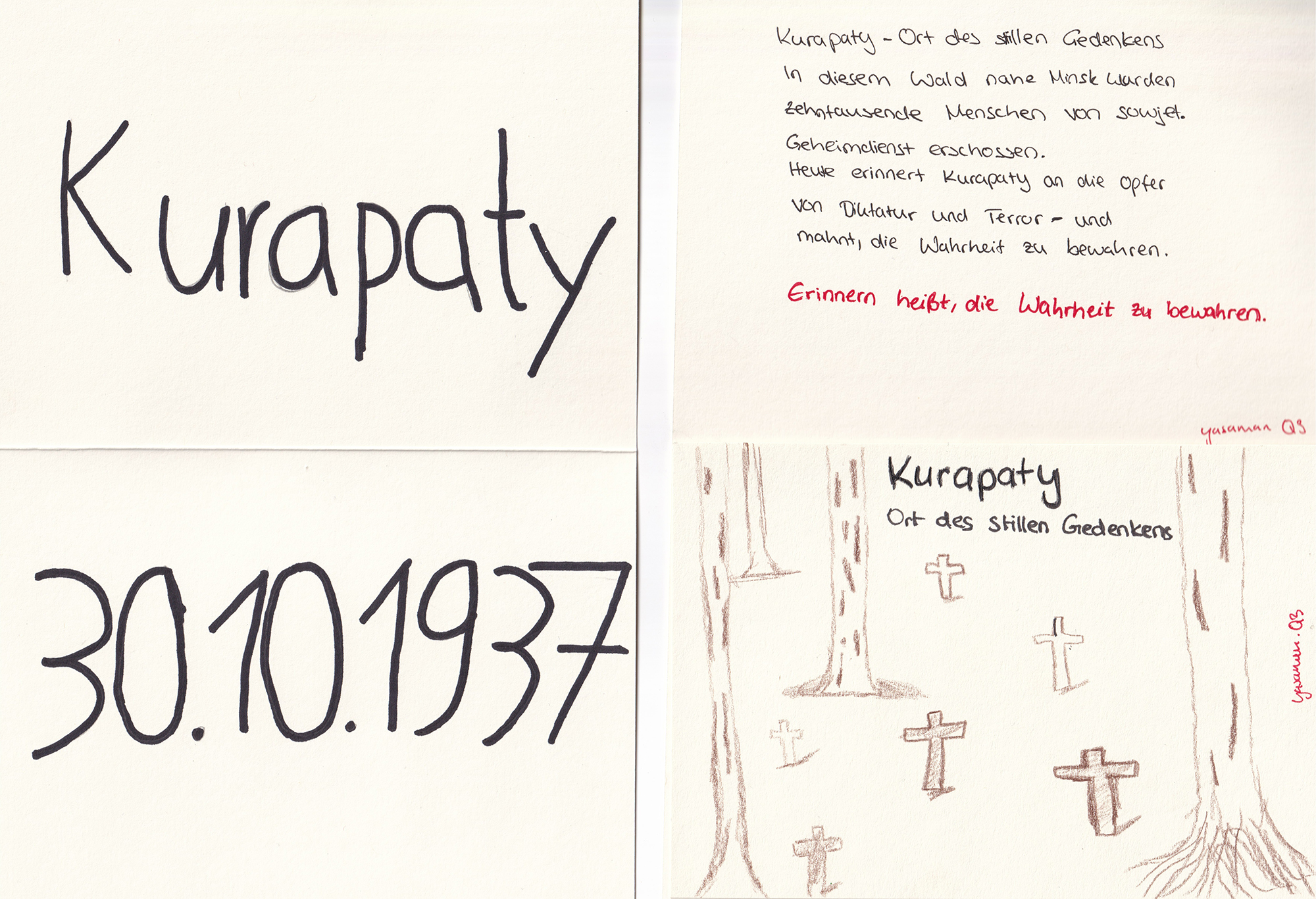 Nach einer Einleitung in die Geschichte Belarus‘, die sich vor allem auf die stalinistische Herrschaft im 20. Jahrhundert sowie die Machtübernahme Lukaschenkos ab 1994 konzentrierte, lag der Fokus des Workshops auf der Nacht vom 29. auf den 30. Oktober 1937. Damals ließ die sowjetische Führung mindestens 130 Personen erschießen, darunter dutzende Dichter, Schriftsteller und Intellektuelle. Damit einher ging die Verbannung ihrer Werke aus Bibliotheken, Schulen und anderen Bildungseinrichtungen. Diese Oktobernacht markiert den tragischen Höhepunkt des Vorgehens des Sowjetregimes gegen die Kulturelite in Belarus. Die Leichen der Erschossenen vergrub man in einem Waldstück nahe der Hauptstadt Minsk, „Kurapaty“. Erst rund 50 Jahre später begannen Forschende mit Ausgrabungsarbeiten in Kurapaty. Zwischen 30.000 und 250.000 Leichen werden dort vermutet. Dutzende Kreuze sollen an sie erinnern. Die Zahl klafft unter anderem so weit auseinander, weil das Lukaschenkoregime noch immer nicht alle Archive öffnet, Aktenansichten verhindert und sich aktiv gegen die Aufarbeitung einsetzt. Nach der Fälschung Lukaschenkos Wahl 2020 kommt es zu massiven Ausschreitungen in Belarus, die Polizei geht gewaltsam gegen Demonstranten vor. In Kurapaty werden die Kreuze, die an die Opfer des Stalinregimes erinnern sollen, kurzerhand zerstört und vernichtet. Eine Aufarbeitung unter Lukaschenko ist nahezu unmöglich.